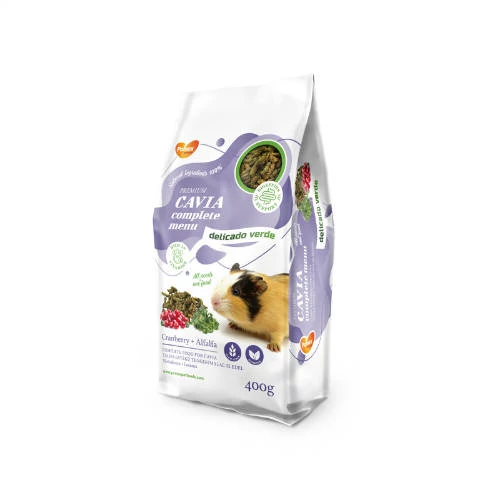 A Delicado Verde Complete Menu optimálisan összeállított receptúráját úgy alakították ki, hogy megfeleljen a tengerimalacok táplálkozási igényeinek. A szárított lucerna (59%) és a szárított vörösáfonya (1%) gazdag vitaminokban és ásványi anyagokban. Emellett a táp alacsony zsírtartalmú (2,5%), így kiváló választás azoknak az állatoknak is, akik hajlamosak a túlsúlyra.
